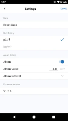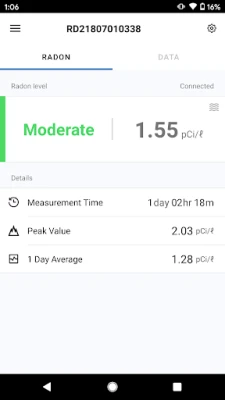 homeowners. It has the high sensitivity 0.5cpm/pCi/l, about 20~30 times more than conventional radon detector. RD200 has a dual Structured pulsed-ionization chamber system and a highly accurate detection circuit. Its first reliable data out time is below 1hour from measurement start. The Bluetooth function allows you to record data, display graphs conveniently and set alarms using your smartphone.