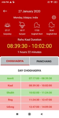 Detailed panchang view showing the sunrise and sunset for the chosen location. Day and Night Choghadiya, Rahu Duration and Others. All calculated for your chosen location.